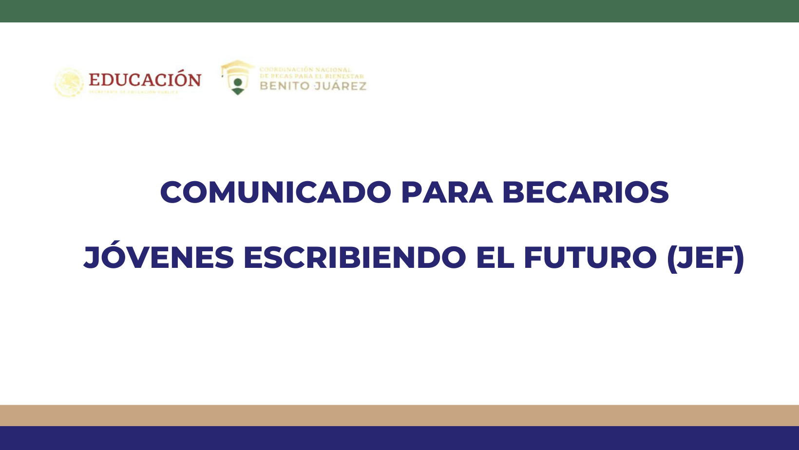Comunicado para Becarios Jóvenes Escribiendo el Futuro Posted on 3 agosto, 2023 - 3:32 pm by ELIAZAR AYALA ZAMUDIO Consultar el Oficio Circular No. CNBBBJ/DGOVAC/175/2023